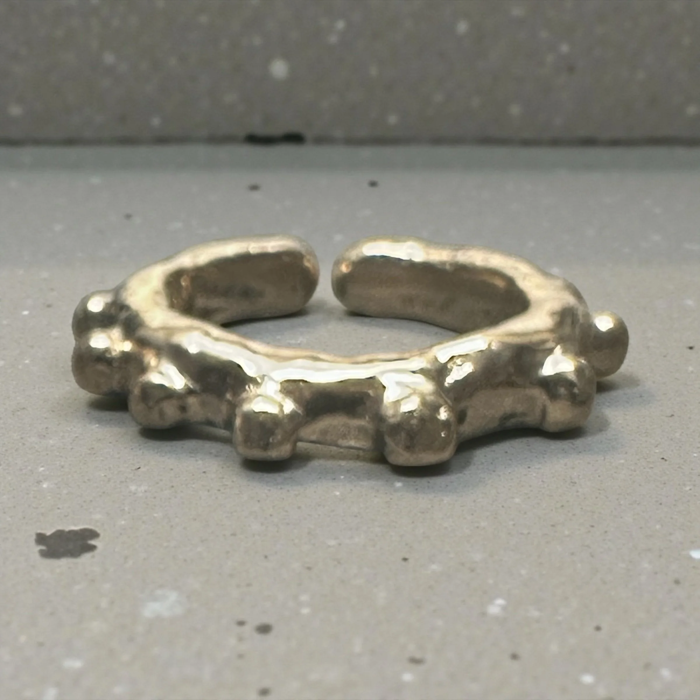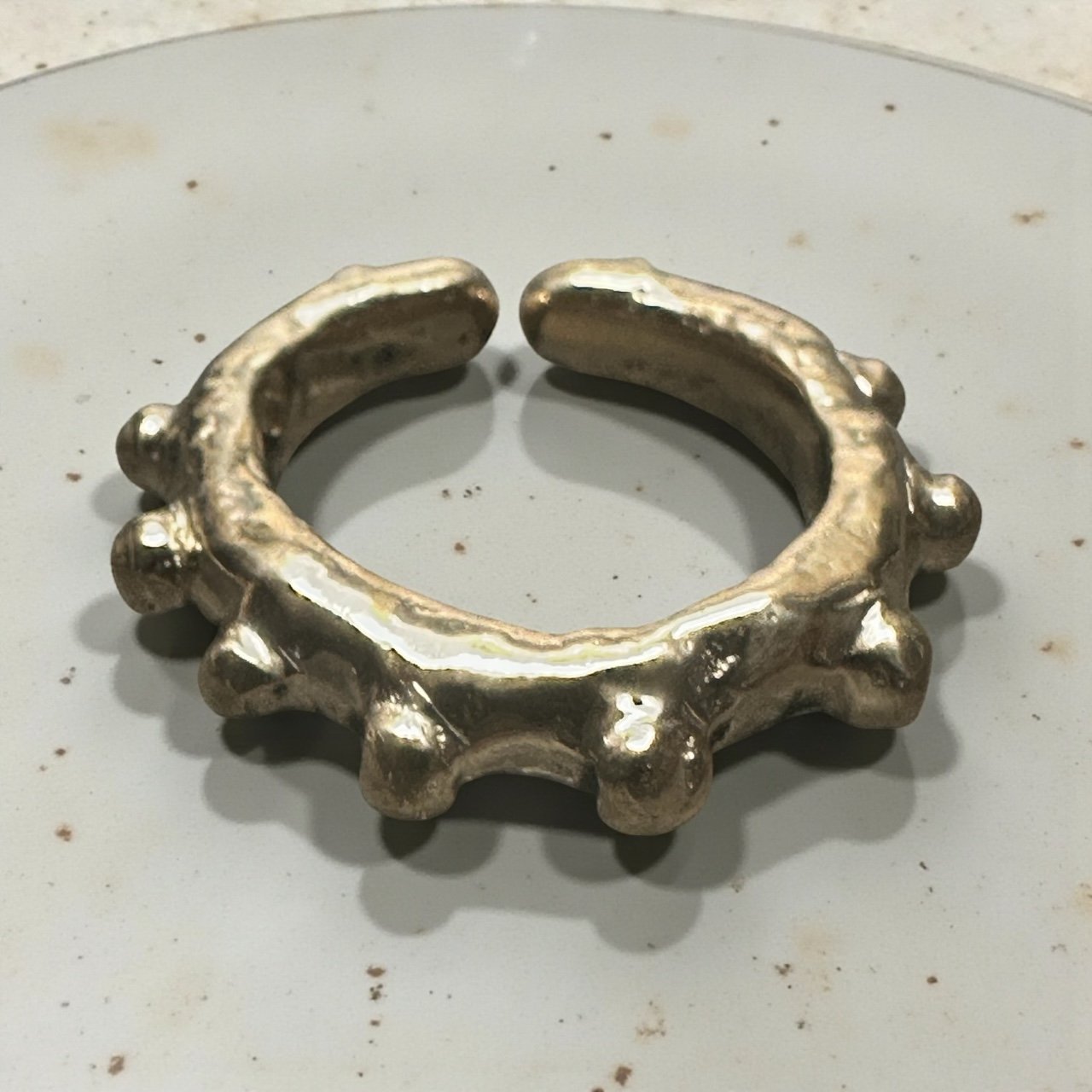 1 1/4” long x 1 3/16” wide, adjustable ring size down to size 6